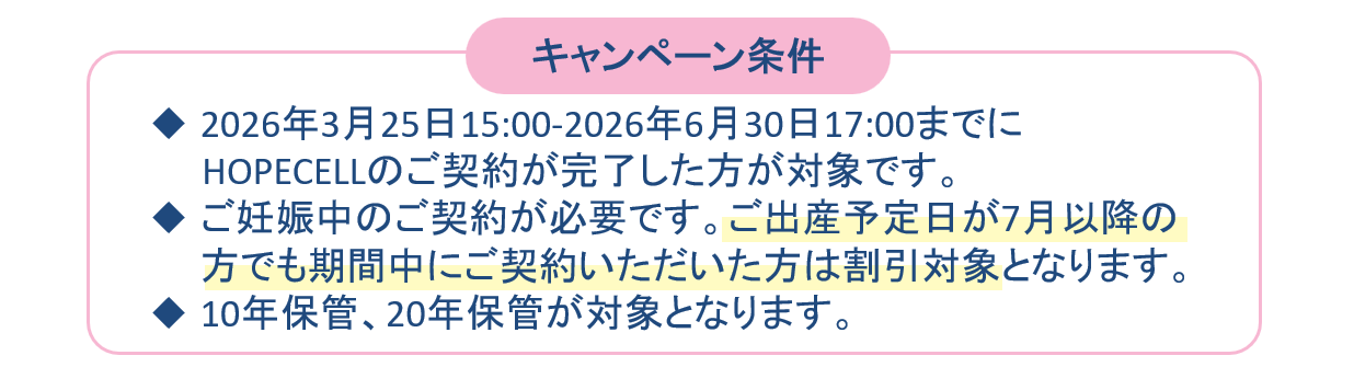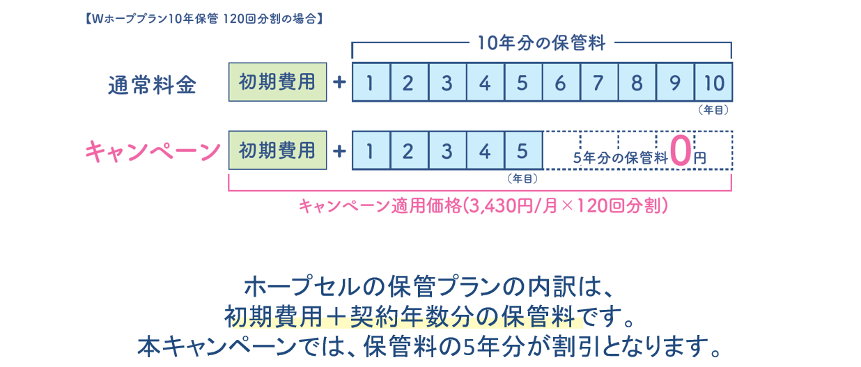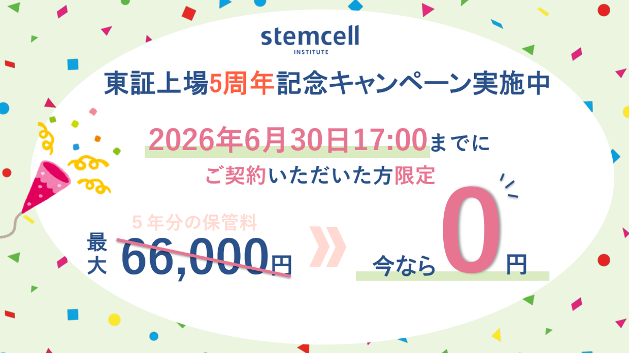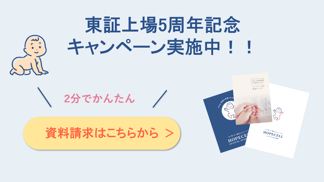 2026年03月25日 東証上場5周年記念キャンペーン実施中 ご好評につき、保管料5年分割引キャンペーンを延長 2025年12月より5年分の保管料が無料(最大66,000円)となる「HOPECELL 1周年記念キャンペーン」を実施しており、想定を上回る反響をいただき、多くのご家族にご利用いただいております。 HOPECELL 1周年記念キャンペーンのご好評を受け、5周年にちなみ保管料5年分を無料とする本キャンペーンを、「東証上場5周年記念キャンペーン」として継続実施することといたしました。
